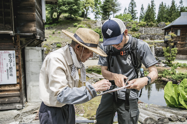 見倉集落のおじいさんから、古道について聞き取りをする鈴木さん。アスファルトの県道を歩かない古道があった!