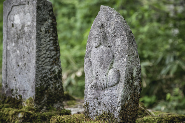 大赤沢集落と小赤沢集落を繋ぐ古道「牧之の道」に立つ石仏。かつては旅人を導く道標だった。