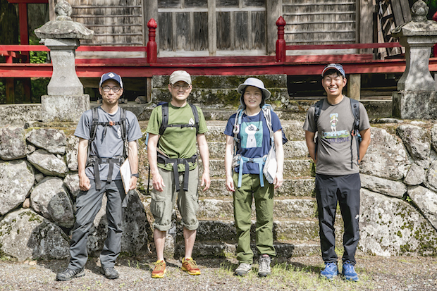 今回いっしょに歩いた信越トレイルクラブ事務局のみなさん。左から、米国の三大ロングトレイルのひとつアパラチアン・トレイルを2016年に踏破した鈴木栄治さん、学生時代にニュージーランドの名トレイル、ミルフォード・トラックを踏破した経験がある大西宏志さん、信トレのことならこの人に聞け「信越トレイルの看板娘」内野美雪さん、今春スペインのサンティアゴ・デ・コンポステーラの巡礼路を歩いてきたばかりの浅井忠博さん。