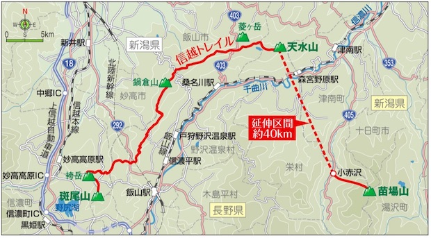 信越トレイルの北東端、天水山から南へと進路をとり、日本屈指の秘境・秋山郷を通って、日本百名山の苗場山まで延ばす計画が、いよいよ動き出したのだ。