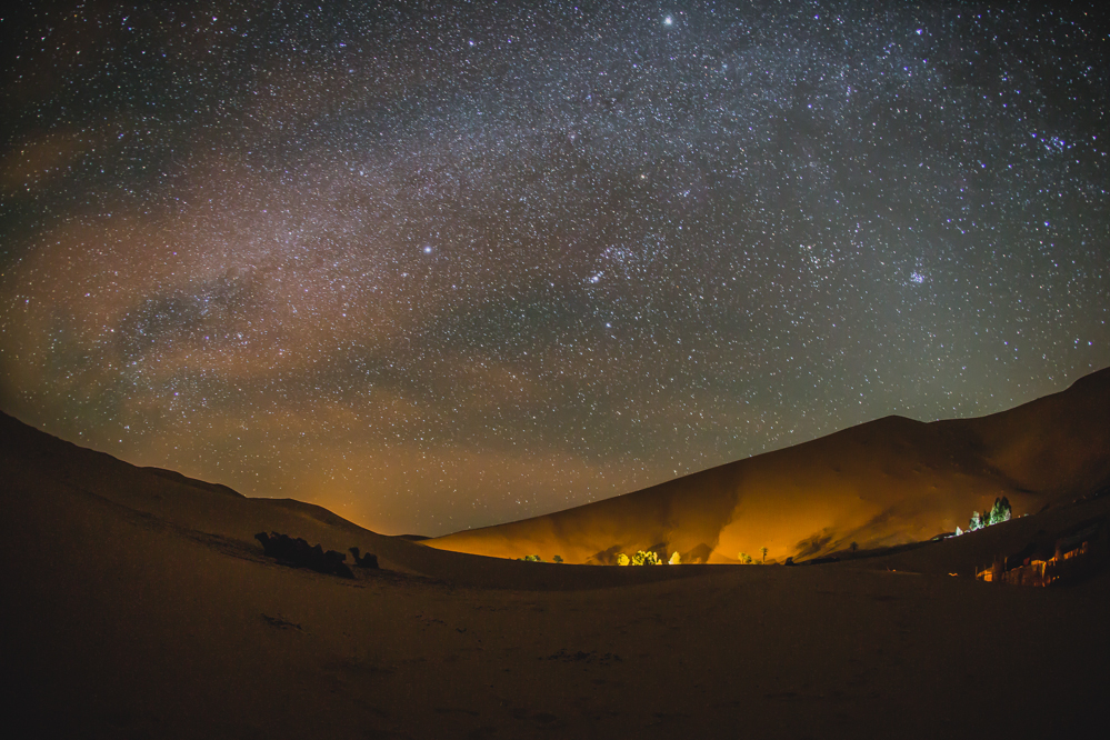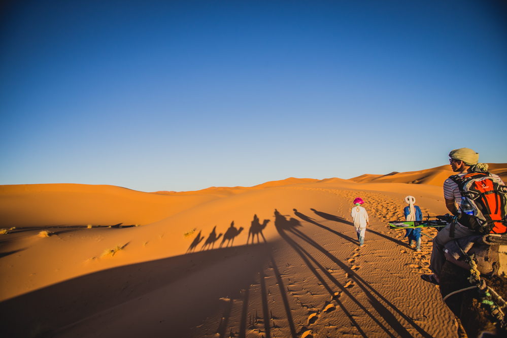 徐々に陽は傾き、ラクダの長い脚が砂丘に映し出された。砂漠には全ての音を吸収してしまうような静けさがある。そんな深い静けさの中にいると、みんな口数が少なくなり、やがて言葉は必要なくなった。ベルベル人が住むキャンプに辿り着く頃には、とっぷりと陽がくれて、空には糸のような三日月が輝いていた。