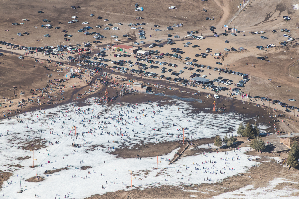 赤茶けた土に目が慣れていた俺たちに、その色彩は眩しく鮮烈だった。たっぷりと雪をまとった巨大な雪山が、デンと鎮座していたのだ。目を凝らすと、Tバーらしきものが見える。その奥にはリフトがかかっており、それは何と巨大の山の頂へまっすぐに伸びているではないか!