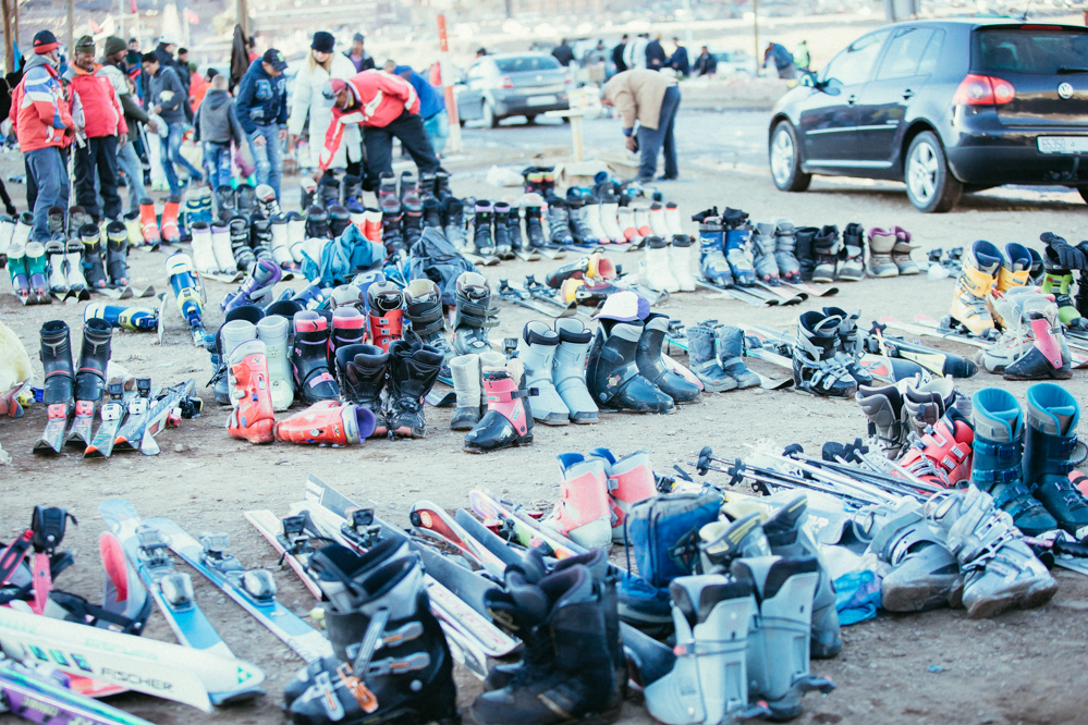 オカイムデンスキー場に到着した俺は、その光景に圧倒されていた。まるで砂糖に群がるアリンコの大群のように、人々が雪に群がっていたのだ。泥の上に、レンタルのスキー用具やソリが所狭しと並び、シャトルバス代わりのロバが行き来している。こんなにたくさん人がいるというのに、ちゃんとしたスキーの格好をしているのは俺だけ。真新しいスキー用具を身にまとった俺を、道ゆく人々が珍しそうに眺めていた。俺は、戦国自衛隊のように、間違った時代に迷い込んでしまった心境だった。