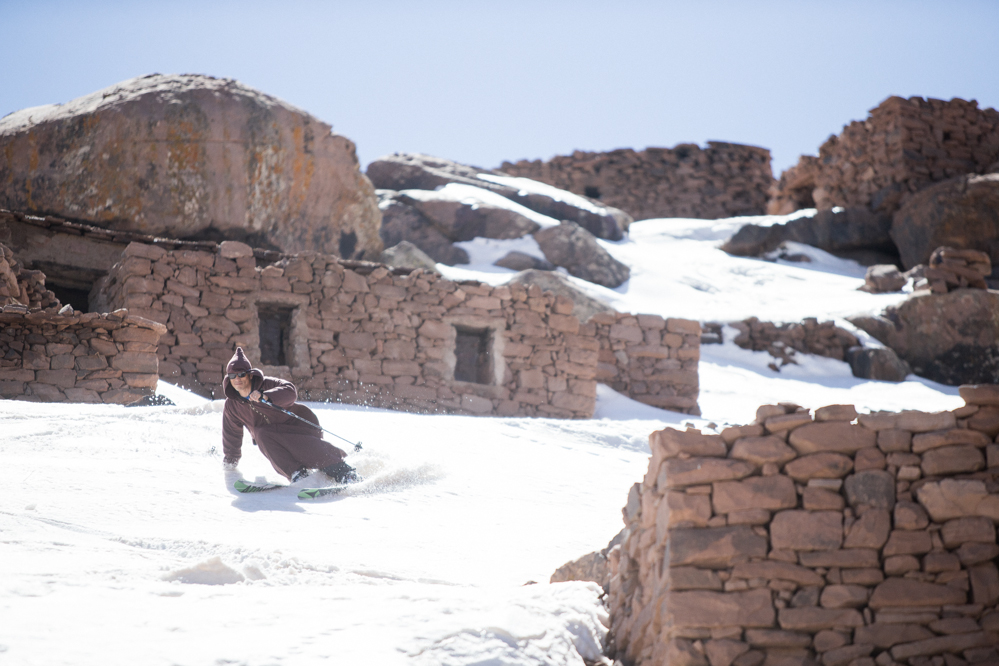 日本には絶対にないロケーションの中、モロッコの民族衣装(ジュラバ)を身にまとって滑る。スターウォーズのルーク・スカイウォーカー気分