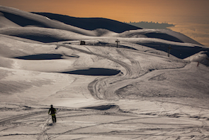 ソリに興じる人々を回転競技の旗門のようにかわしながらスピードを上げて行く。ソリのエリアを抜けると、奥に広大なバックカントリーが広がっていた。背中に熱い視線を感じながら、さらにスピードに乗る。と、そのとき......!