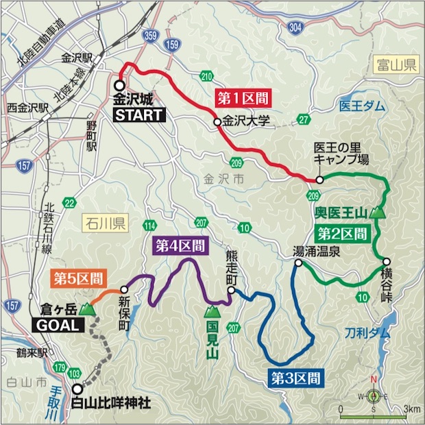 第五区間の倉ヶ岳が最終地点で、金沢トレイルは終了する。なので、点線で白山比咩神社まで記載しているのは、ハイカーに白山まで歩いて欲しいという気持ちの提案なのだ。(地図製作=オゾングラフィックス)