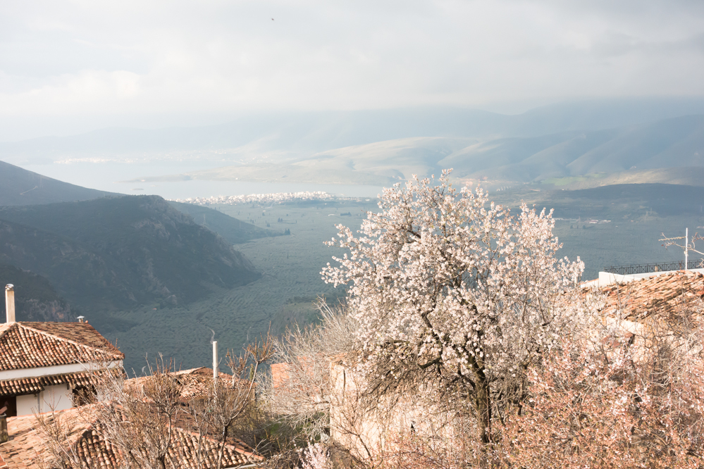 デルフィの街は桜が満開だった......と思ったら、アーモンドの花だった。とにかく、2月後半だというのに、もう春めいてきていた。