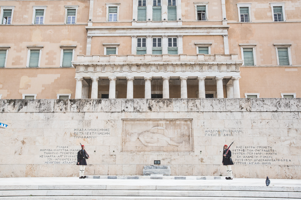 アテネの中心地、シンタグマ広場にある無名戦士の墓。ユニークな格好をした兵隊さんに目が釘付けとなり、15分くらい飽きずに眺めていた。