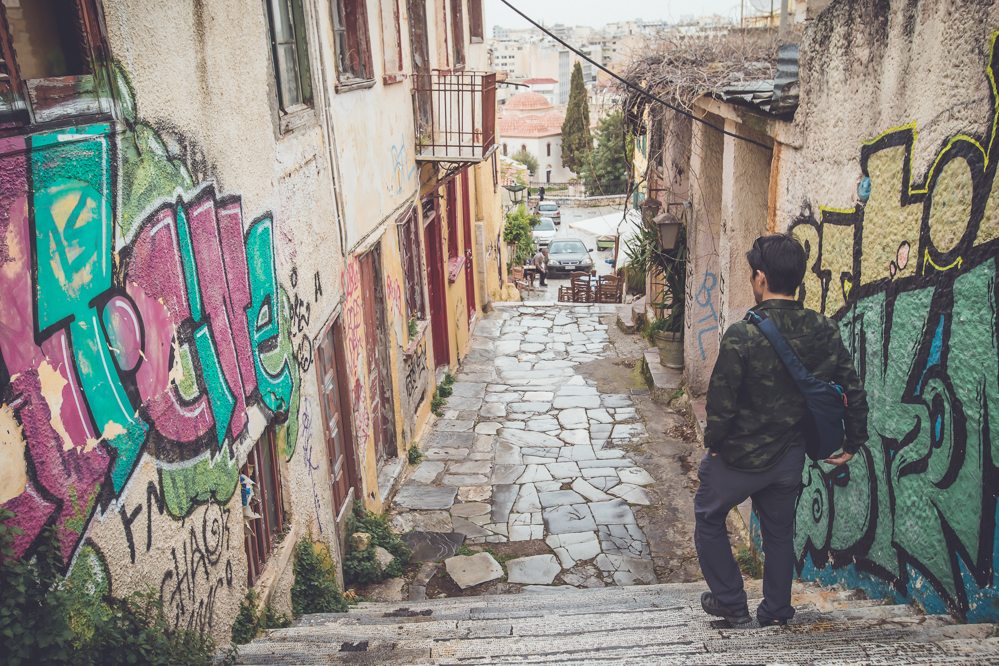 アテネのアクロポリスの路地裏を散策。歴史の深さと落書きの派手さのミスマッチが、なんともいえない雰囲気を作り出していた。