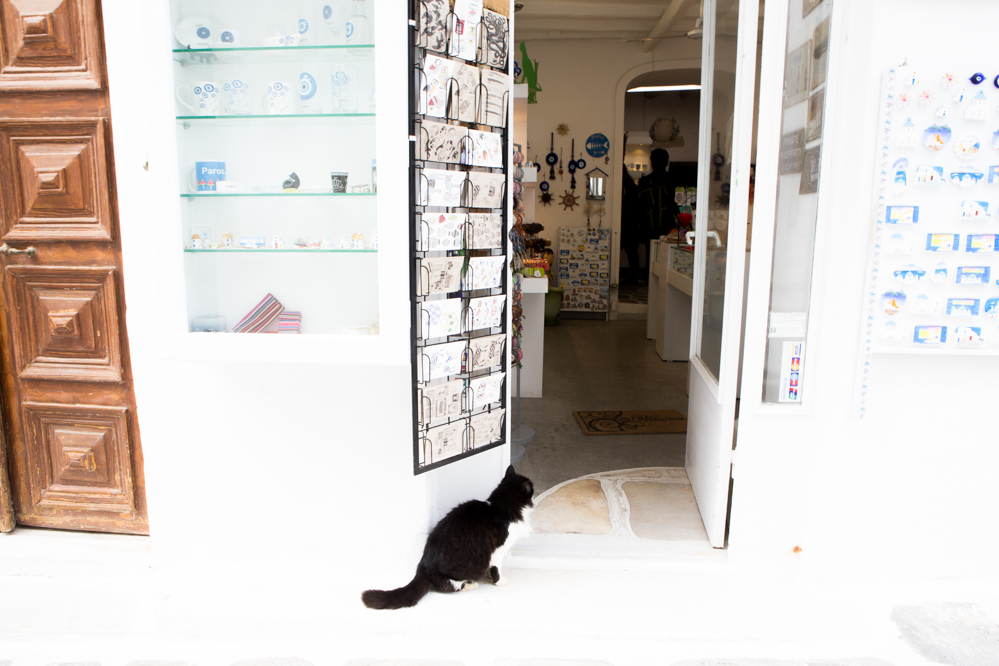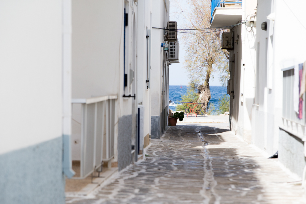 白い家が建ち並ぶ路地の向こうにギリシャブルーの海が見える。まさにギリシャのイメージそのものの景色に、柄にもなく一般的な観光客のようにはしゃいでしまった。