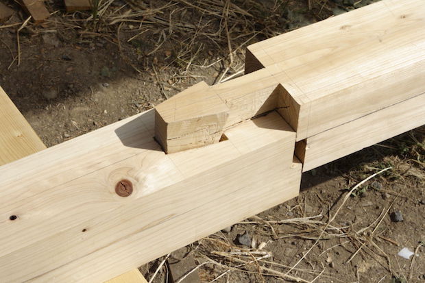 材木を繋ぐのに多用した「腰掛け鎌継」。「伝統工法の技術のなかから、比較的強度が高く作りやすい技法を取り入れました」