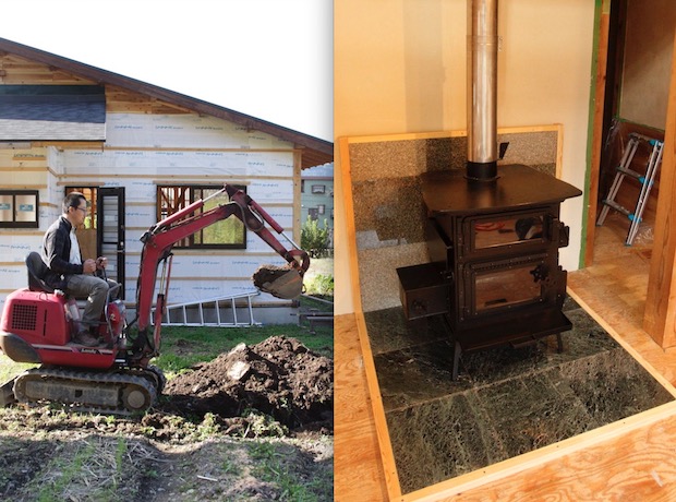「パワーショベルは水回りの配管の埋設に活躍。いただいた御影石は薪ストーブの周囲に貼りました」