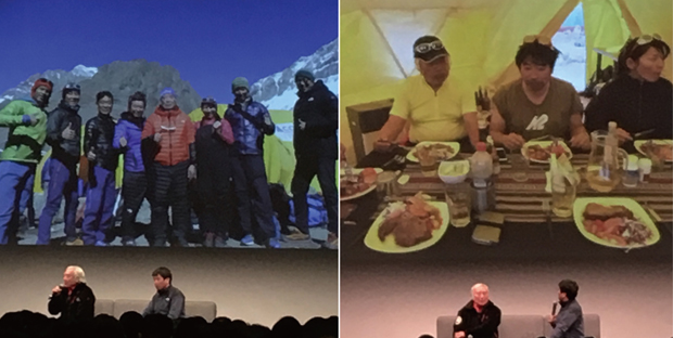 上映が終わると同時に、三浦雄一郎さん・豪太さんが登壇されてトークショーが開始。写真や地図をみながら、今回の作戦、食事、医療、現地の環境についての詳細をおふたりの言葉でたどっていきます。