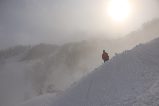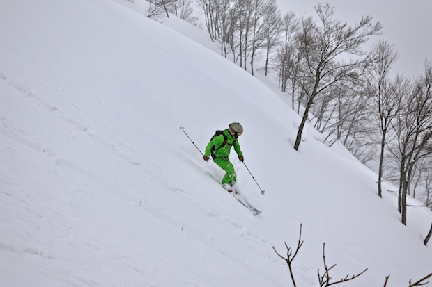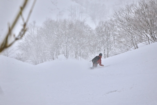 ロープウェイで頂上付近へ上がったら、西側の斜面へと滑り降りる。麓では心配された雪質も頂上付近では上々。スノーボード、テレマークスキー……と、それぞれの道具で斜面へと飛び込んでいく。