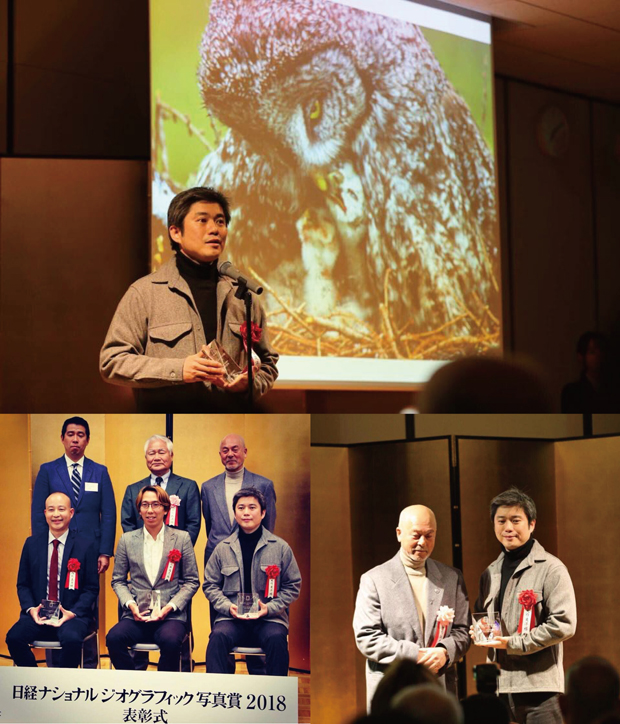 2018年日経ナショナルジオグラフィック写真賞授賞式の様子。受賞作品「北の森に生きる」は、カナダのマニトバ州のまだ肌寒い早春の森で撮影したカラフトフクロウ(英名=Great Gray Owl)の母鳥がヒナに給餌している光景を捉えたものだ。受賞作品をバックにスピーチする大竹さん。 / 写真:河野 透