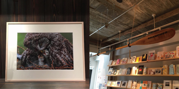 写真展に向けて、準備が進んでいる店内の様子。ナショナルジオグラフィック写真賞 ネイチャー部門最優秀賞の受賞作品「北の森に生きる」も展示される。被写体となったカラフトフクロウは、全長61〜84cm。世界最大級の大きさを誇る。/ photo:Storage books & gallery