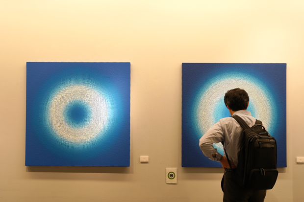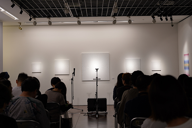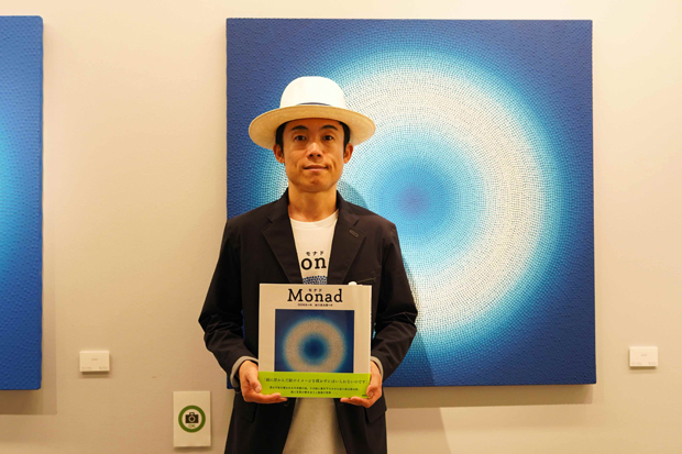 「モナド」の表紙になっている、青と白の円形の世界「ひかり」。ライブの際に、GOMA氏の背面に展示されていた、白くキラキラと輝く世界「珊瑚」。正面奥に6点並んでいた、青と白が滝のように流れる世界「Water fall」。そして、今回初めて発表したというカラフルなドットの世界「羽衣」。