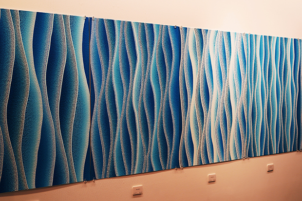 (上)「モナド」の表紙にもなっている作品「ひかり」100x100cm (下)圧巻の迫力!滝のように流れ落ちる世界感を描いた「Water fall」。作品1つの大きさが、72.8×103cm! 6点並べると、横幅は約4.3mにもなる。