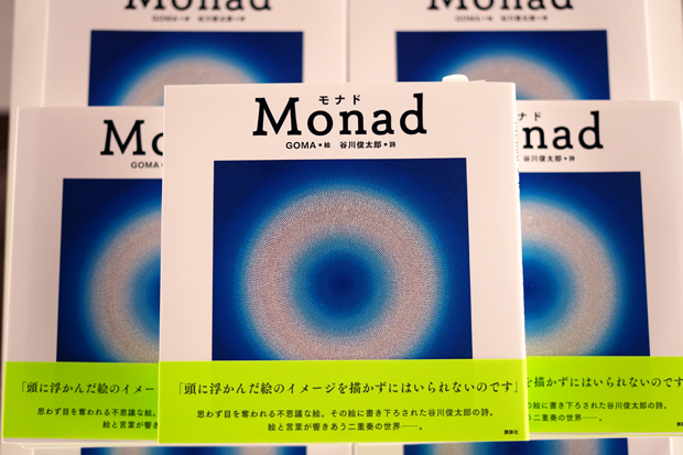 この展示会のきっかけとなった詩画集「モナド」は、GOMA氏が不慮の交通事故に遭った2009年以降、9年間描き続けた500点以上の作品の中から、詩画集のために24点を厳選。谷川俊太郎氏が、この絵画を見たインスピレーションから23篇の詩を書き下ろしたというもの。