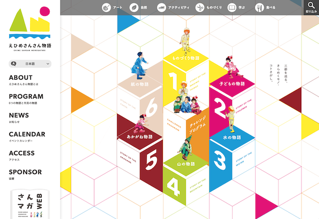「えひめさんさん物語」は新居浜市、西条市、四国中央市の3市の「地域の資産」とアート、アクティビティを融合させ、6つの物語(ジャンル)でさまざまなイベントを実施。「ものづくり物語」では合計18の企業が工場を特別公開。「子どもの物語」では子どもたちが「子どものまち」を作り上げ“東予で暮らす”ことを様々な視点から提案。「水の物語」では水の都と呼ばれる西条市を取り上げ、「あかがね物語」では東洋のマチュピチュと呼ばれる人気スポットの魅力に迫り、「紙の物語」では紙のまち・四国中央市で紙にまつわるアートパフォーマンスなどを実施。前回紹介した「マウンテンアカデミーin石鎚山」は「山の物語」に属し、ほかにも石鎚山脈をフィールドに多彩なイベントが展開される。地域の住民や企業、団体が主体となった90件を超える「チャレンジプログラム」も常時開催される。