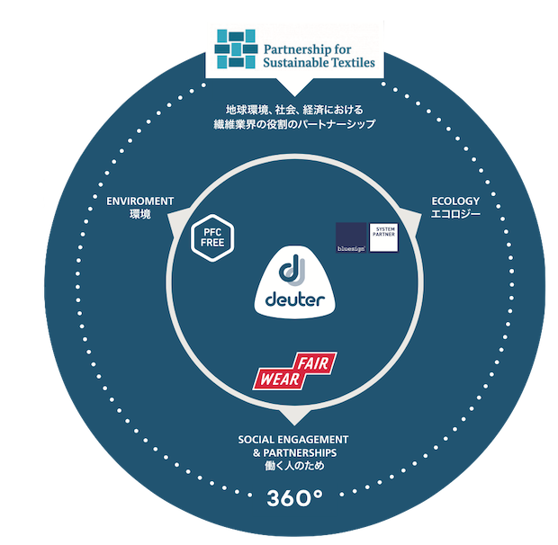 ドイターの製品を中心として、そのまわりを「企業体」「環境」「エコロジー」「労働」といったキーワードが取り囲むといった状態だ。環境や労働条件の改善をテーマとした業界団体とのパートナーシップの締結、関係機関の定める「規格」や「基準」の承認と実行、そして環境負荷の掛からない素材選びの実践である。