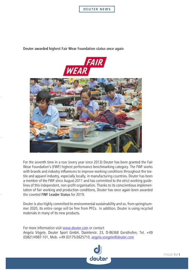 ドイターのこの取り組みはいまに始まったことではない。2008年にブルーサインのシステムパートナーとして承認され、11年にはフェア・ウェア・ファウンデーションに加盟している。さらに、13年から7年連続で同枠組みのリーダーステイタスを取得した。14年にはサスティナブル・テキスタイルとも活動をともにし、20年の今年は環境負荷の高いPFC撥水素材からの完全な脱却(PFC FREE)を実現するにいたっている。