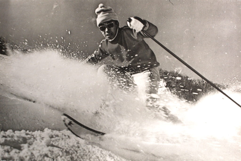スキーのアルバイトでモデルに。八方尾根で何本も滑った。この写真はFフィルムのパンフレット用だったが、同時に銀座のサロンで数mのウィンドウに透過フィルムで展示された。撮影=本多信男