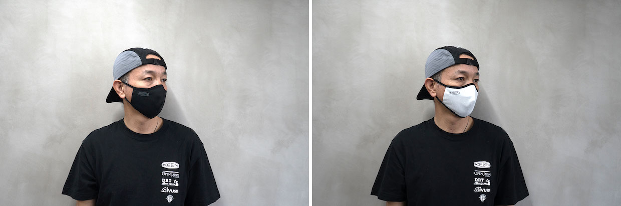 マスクの素材にはシューズで使用する生地を活用している。シューズ製造を行なうKEENの得意分野である立体縫製を活かした立体マスクは、フィット感が高い。