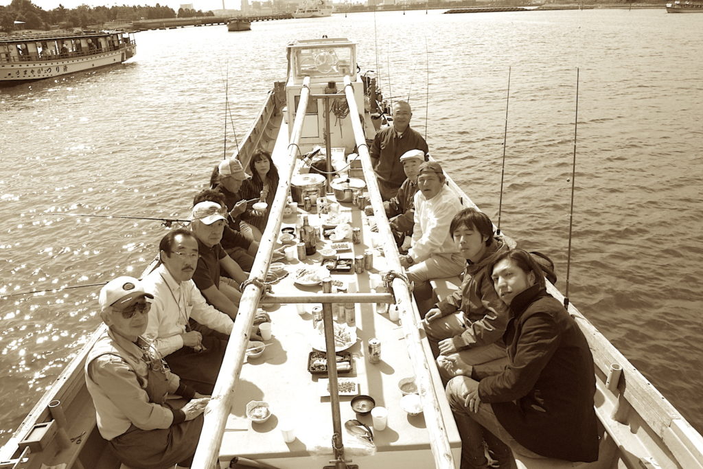 「江戸前天ぷら付きハゼ釣り」のお昼の風景。これは10年ほど前の写真で、船は大型化しグラスファイバーになったが基本的にはむかしと変わらない。持ち込んだビールを飲みながら天ぷらの揚がるのを待つ。竿を出したままにしておくとこの間にも釣れることがある。みんなから非難ごうごうとなること必至。久しぶりに一族や友人と過ごす楽しいひとときだ。
