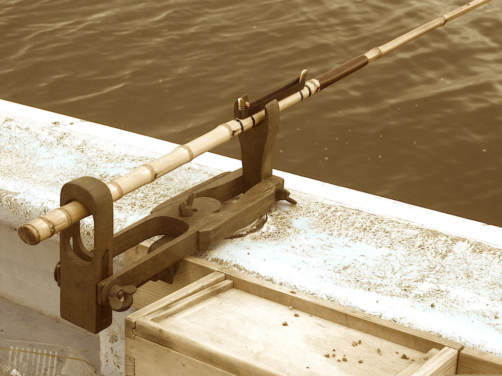 竿掛けとエサ箱を船にセットし、竿を掛ける。この竿掛けは木製のかなり古いもの。僕が初めてハゼの船に乗ったとき親父から与えられたもの。当時は古くて恥ずかしかったが、手入れをしていまでも使っている。竿は竹竿。この釣りだけはグラスやカーボンではだめだ。長さの違う和竿を数本持っていき、虫干しを兼ねてみんな出して使うことにしている。