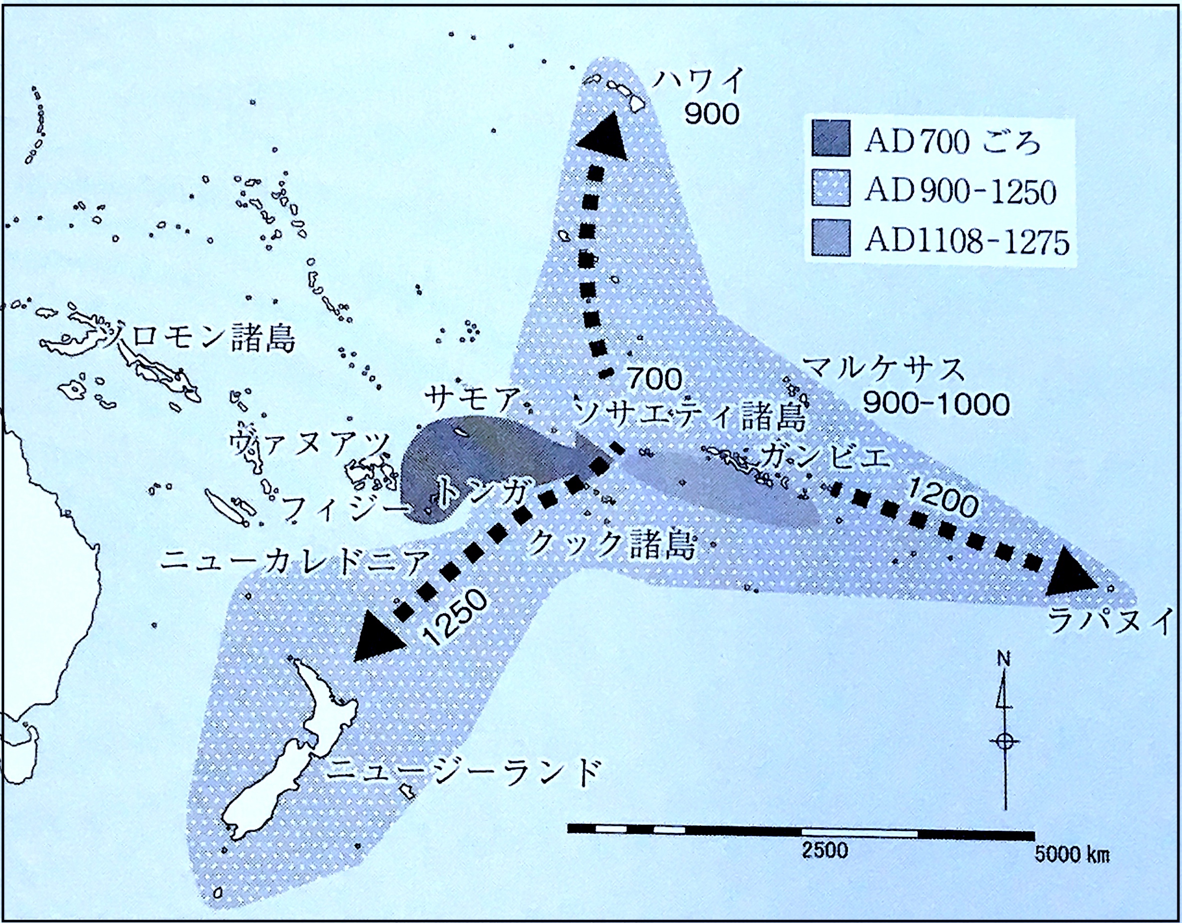 じつは、ポリネシア考古学を継承する日本の研究者は少ない。長きにわたって研究を継続できたのは、篠遠博士ただひとりと言っていい。一方、ミクロネシア考古学は世界的なレベルだ。編者のひとりである印東道子博士は、その第一人者である。その大専門家が自身の研究とは無縁ではないにしても、専門地域を超えて多くの海外論文を渉猟してポリネシアの主要な島々への移住年代、移住経路の現在における到達点を以下の図に示している。ポリネシアの島々について執筆しようとする人がいたら、今後しばらくは、この図を参考にしてほしい。