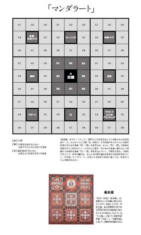 本書は曼荼羅をモチーフとした「マンダラート」と呼ばれる目標実現ツールを使い、彼の強さと進化の原動力を探るものである。マンダラートとは縦横各3マスからなる正方形の中心に目標を掲げ、周囲の8つのマスにその達成に必要と思われる要素を配したもの。さらに各要素についてもまた実現に向けた8つの要素を考え、実践してゆく。ともすれば漠然としがちな目標達成へのプロセスを、可視化、指標化することが狙いだ。