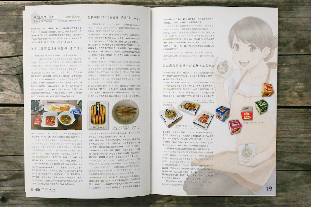 C2機関が人気サークルへのスターダムをかけ上がれた理由のひとつはかわいいイラストではありますが、特筆すべきは彼女らの企画力と取材力です。同人誌で企業へ取材に行くというのは結構ハードルが高かったりしますが、同誌ではマルハニチロの鮭缶工場、ノザキのコンビーフ工場、メーカーの本社や缶詰Barなどを取材し、一歩踏み込んだ缶詰の魅力を伝えています。