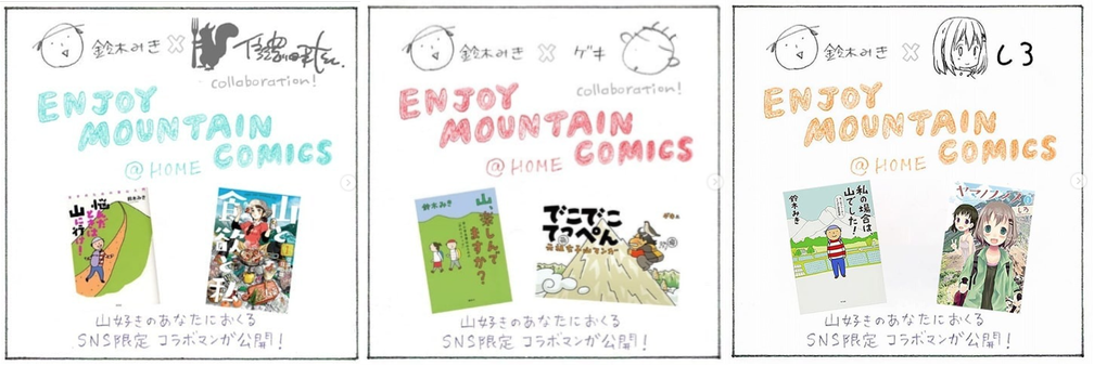 コロナ禍のいまである。山に行けない、行きづらい日々にもんもんとした緊急事態宣言が続いていたあの時期、みきさんは山まんが仲間ともいえる人気作家たちとインスタグラム上でコラボまんがの企画を展開していた。『山と食欲と私』の信濃川日出雄さん、『でこでこてっぺん』のゲキさん、『ヤマノススメ』のしろさんの3人である。