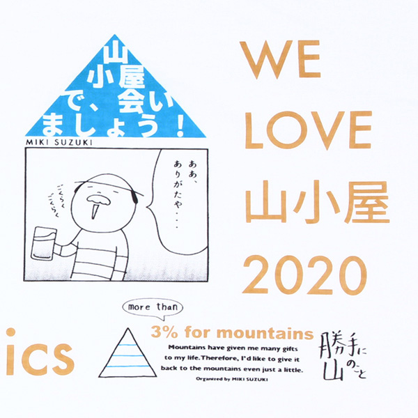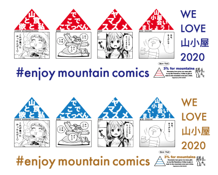 このインスタ企画がきっかけとなり、さらに一歩踏み込んだのが今回の山小屋支援の手ぬぐいで、みきさんのブランド「勝手に山のこと」がその製作元となっている。「#enjoy mountain comics WE LOVE 山小屋2020」と大書きされた手ぬぐいには、前出の山まんが作家たちの山小屋への愛あふれる「ひとコマ」まんがが描かれている。