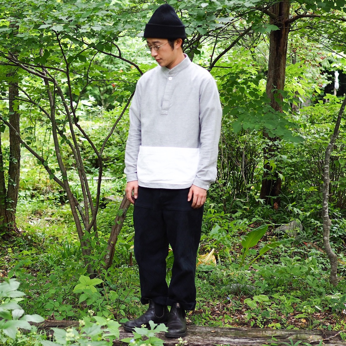 自身でデザインしたプルオーバーシャツを着る沖中さん。アウトドアの使用にも耐えられる丈夫さで、袖を通すたびに気分が高まるような一枚を身につけていたいと思ったのが、製作のキッカケだったそう。