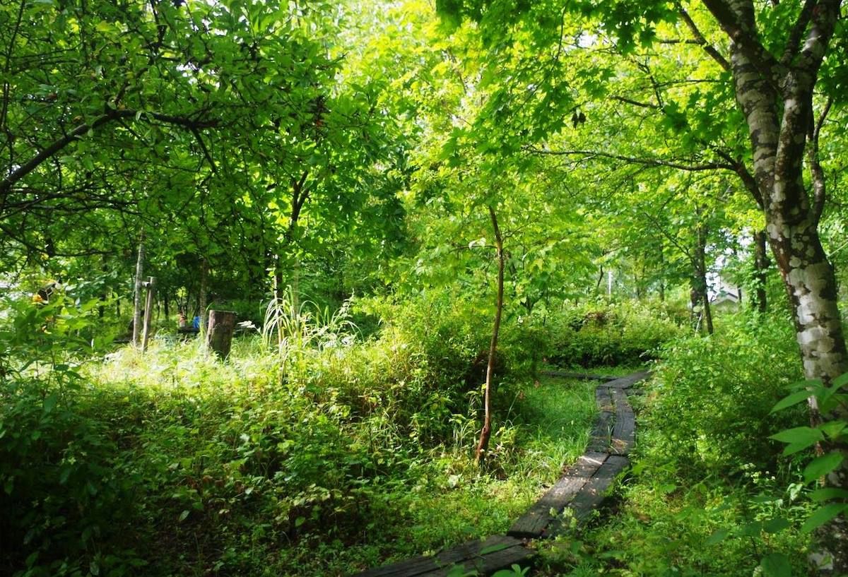 新緑が輝く裏庭。紅葉や雪景色も楽しむことができ、四季の移ろいを感じられるという。
