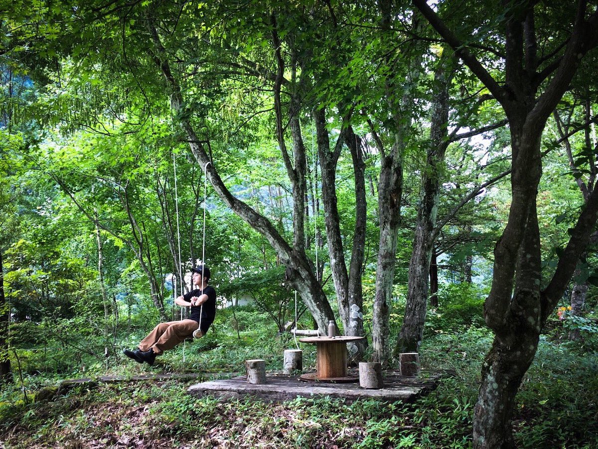 豊かな暮らしに反して、自宅のそばには日常的に遊ぶことのできる場所が少なく、どこへ行くにも時間とお金がかかってしまうことが悩みだったという。そんなとき「せっかくならここでしかできない遊びがしたい」と考えた沖中さんは、仕事終わりに旅館の裏庭へ足を運び、お酒を飲みながら焚き火を囲む、という遊びと出会った。この裏庭は、もともと砂利敷きの駐車場で、お父さんが趣味で木や山野草を植えて緑あふれる場所になったのだとか。仲間や県外から奥飛騨に働きに来ている人たちにも声をかけ、仕事終わりにキャンプを楽しんだという。