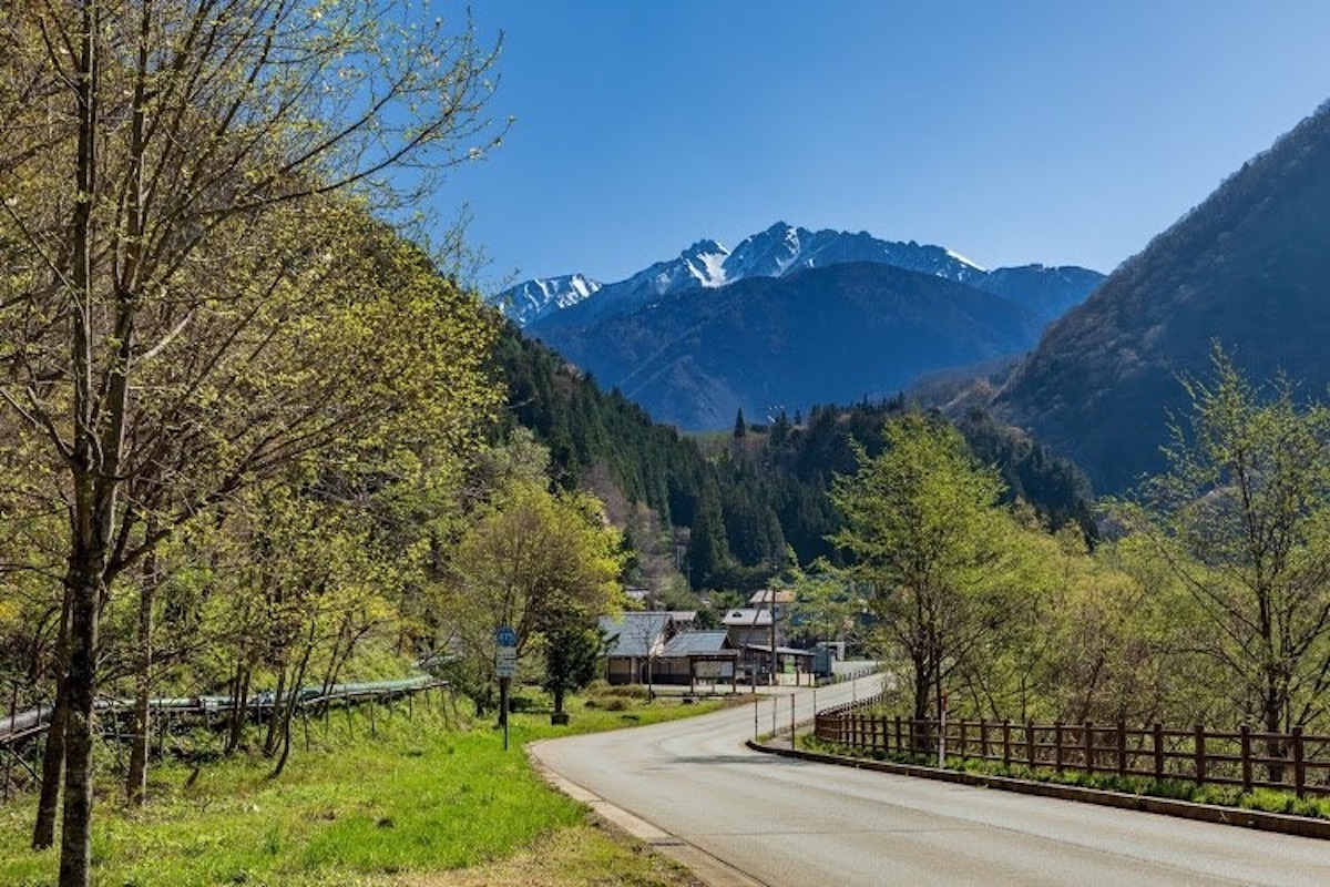 奥飛騨の風景。奥には北アルプスの山々が高くそびえる。