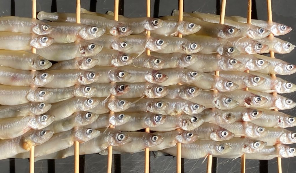 (*1)筏焼き=筏は、木を組んで水に浮かべる「いかだ」のこと。つまり、小魚をいかだ状に横に並べて、縦に細串を打ち込んだもの。それを火で炙って食べる。