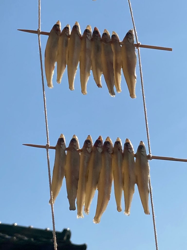 刺し終わった串を2本垂らした凧糸に吊るす。寒い日に干すのが一番いいが、冬だから一晩干せば十分。これをできれば炭火であぶるように焼く。表面の皮が縮れ、わずかに焼き色がついたらそれが食べどきだ。