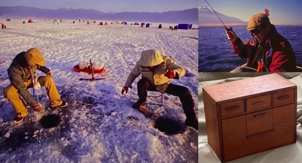 (左)長野県諏訪湖での釣り風景。1990年ごろはまだまだ氷が張り、たくさんの釣りファンが楽しんでいた。御神渡りも見られた。(右上)山梨県山中湖でのボート釣り。背景はもちろん富士山。この風景を見ながらの釣りは本当に清々しい気分だ。ときどき自衛隊演習の爆弾音が聞こえるのがたまにキズ。釣り人はフライフィッシング界のレジェンド、佐藤盛男さん。(右下)山中湖時代に手作りした道具箱。上3つの引き出しはストッパーをつけ外れない工夫が。中央の大きな引き出しは魚入れ。内側には魚が凍らないようにウレタンを貼った。引き出し全体を出さなくても魚を入れられる扉を付けた。これに座って釣るわけだが、この高さは竿の長さとリンクしてくるので赤城では使えなかった。