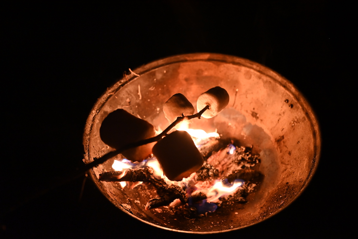 夜には焚き火を起こし、南部独特の長い枝がたくさん生えた木の枝を拾い、棘のひとつひとつにマシュマロを刺して焼いていく。一度にたくさん食べられる “マロツリー” の完成である。