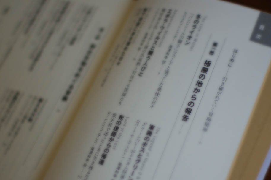 「冬のライオン」。ナショナルジオグラフィックの出版物だけあって、セバスチャン・ユンガー(『パーフェクトストーム』の著者)やピーター・マシーセン(代表作は『雪豹』)など書き手は名手がそろっている。