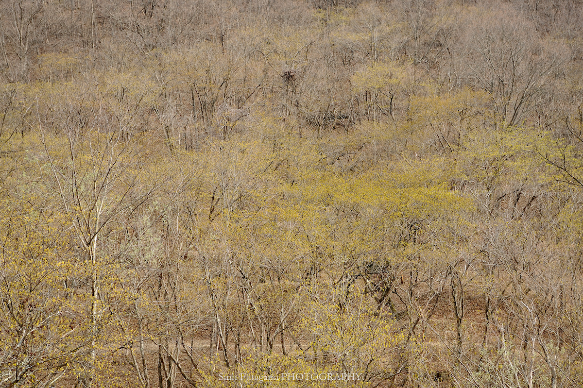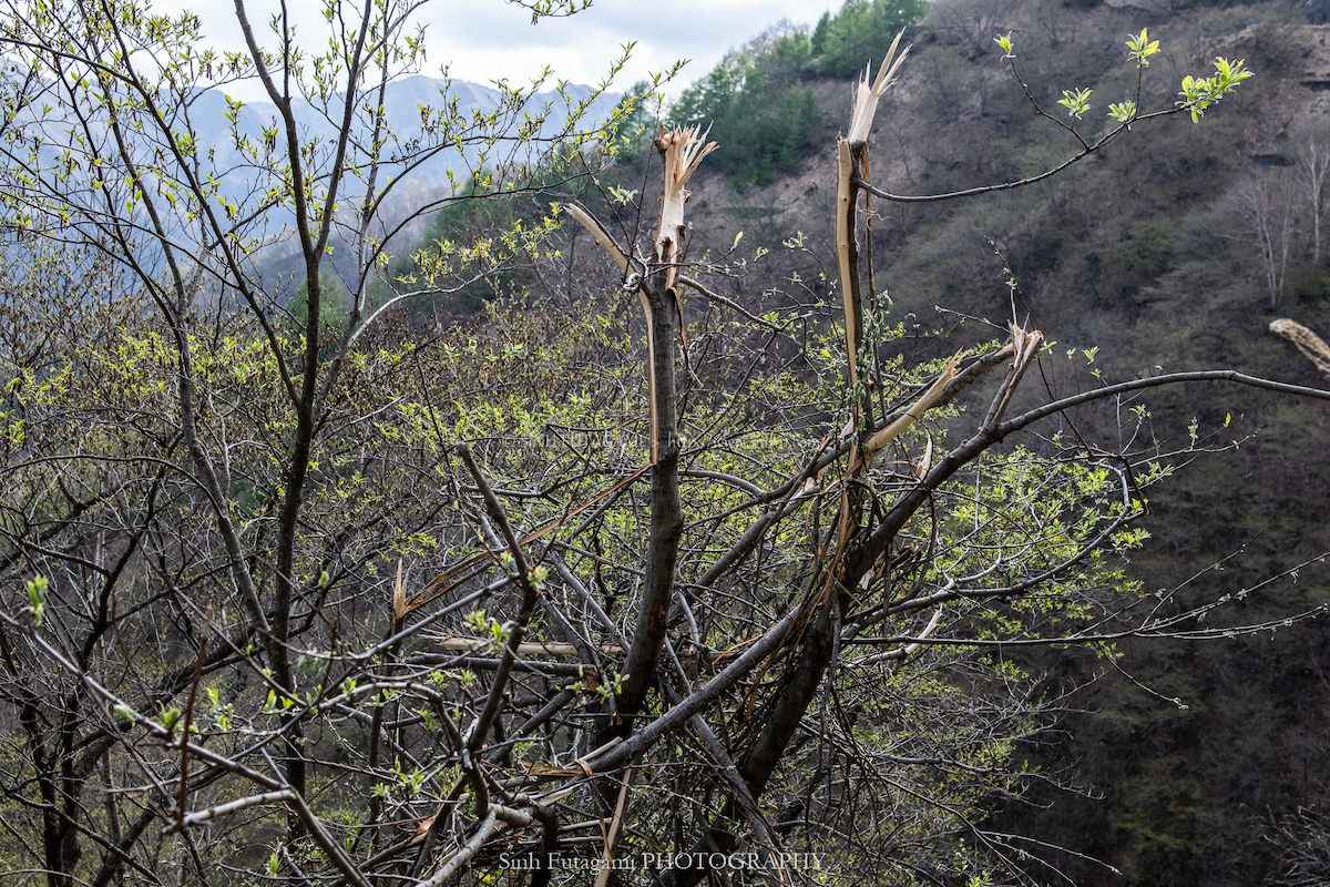 クマダナは残るものもあるので、探せば通年、見つけることはできると思いますが、葉が落ちた冬や、まだ葉が茂っていない早春はクマダナを見つけやすい季節といえます。葉が茂っているときに見つけられなかったクマダナを見つけることも。この写真は沢の対岸の斜面。4月に撮影したものです。どこにクマダナがあるか、わかりますか?