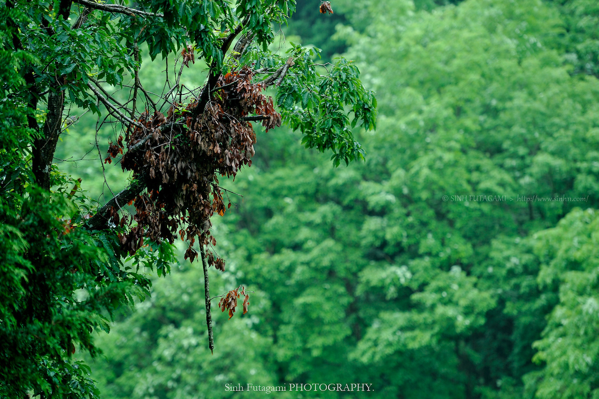 みなさんは、山道を歩いていて、こんな風に不自然な枝の塊を目にしたことはありませんか? これは「クマダナ」といい、クマが木に登って樹上の実や葉っぱを食べた跡です。