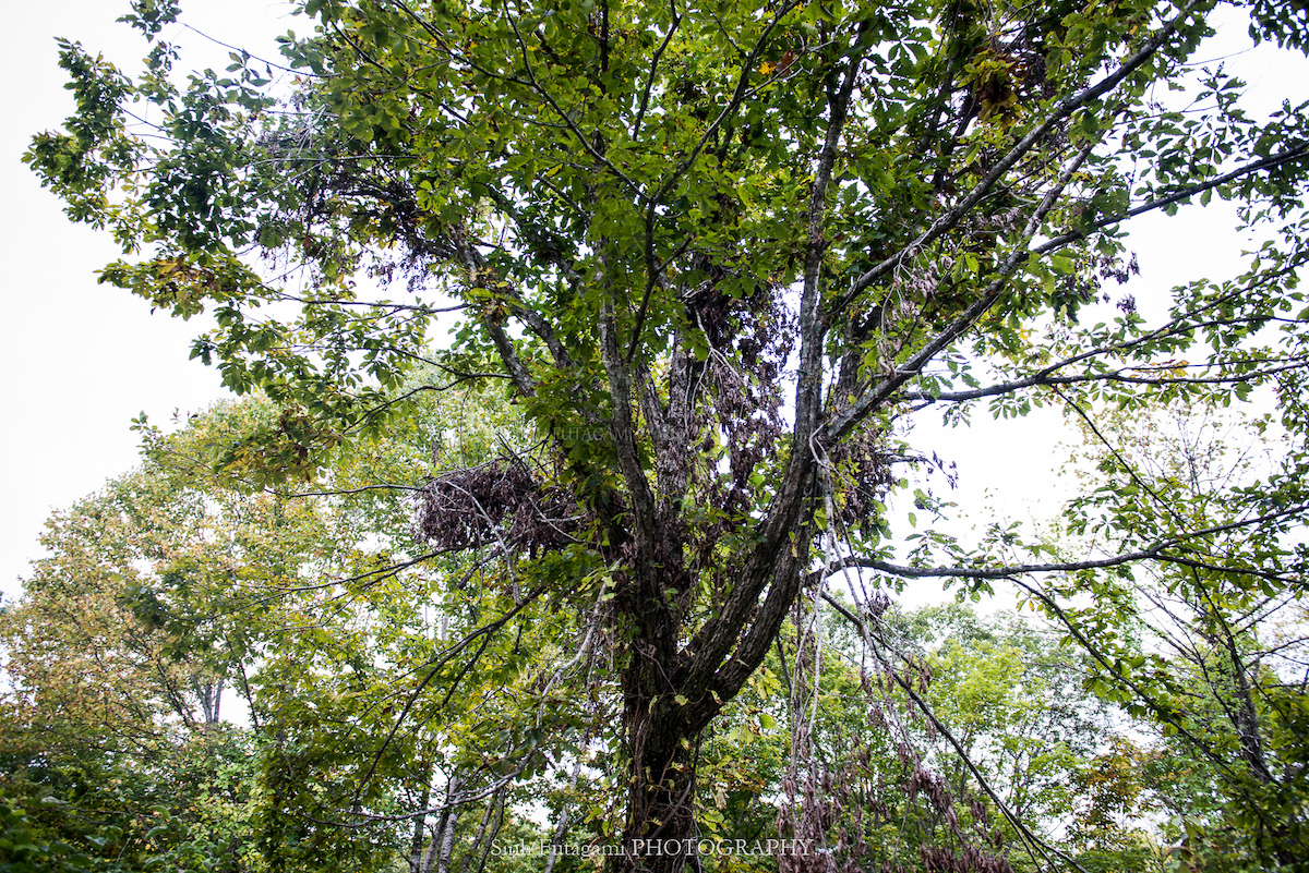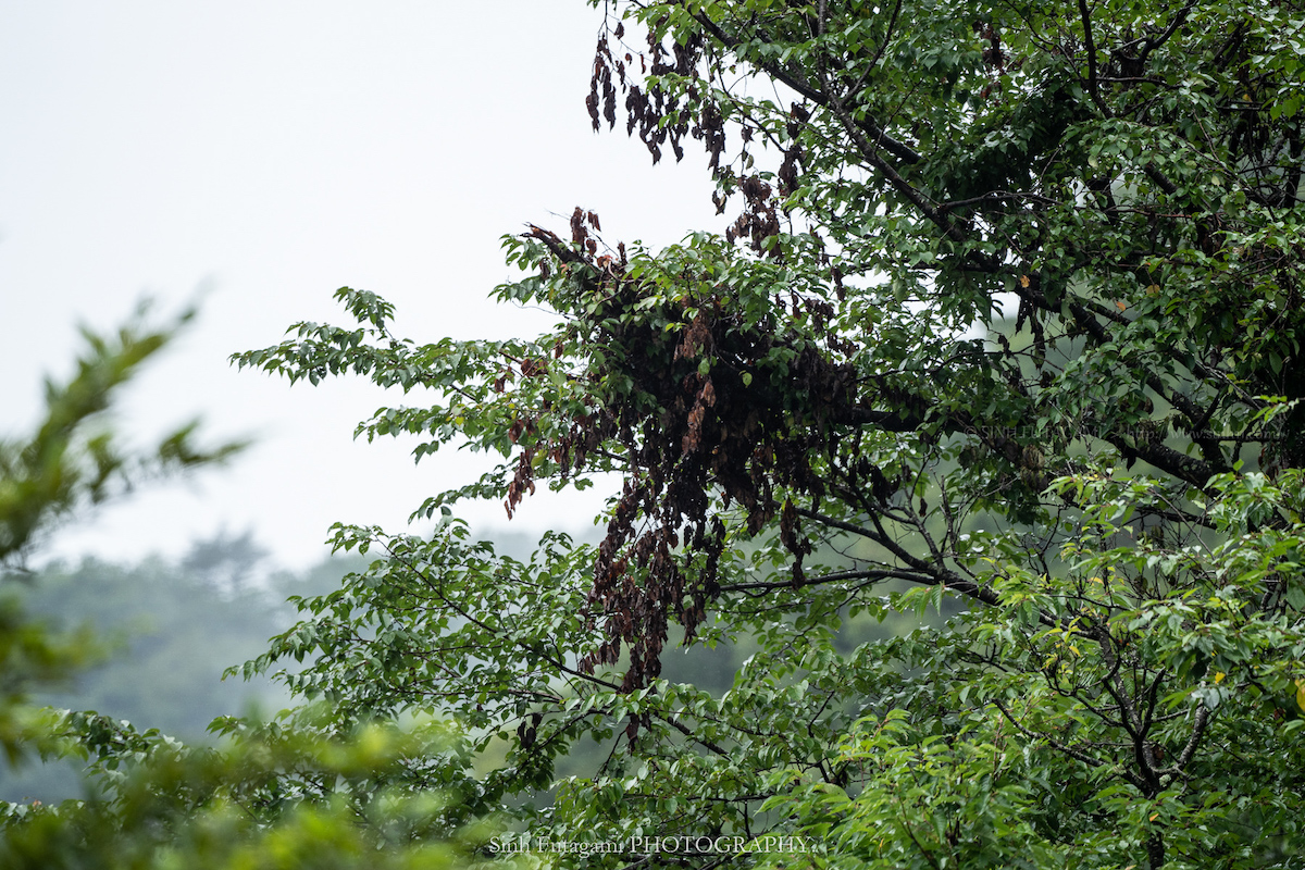 クマダナ、とは少しちがうかもしれませんが、これもクマが木に登った跡です。こちらの季節は初夏。枝の折れた所の色を見ると、痕跡がまだ新しいことがわかります。それにしても、バキバキに折られています。木がかわいそうになってくるくらい……。