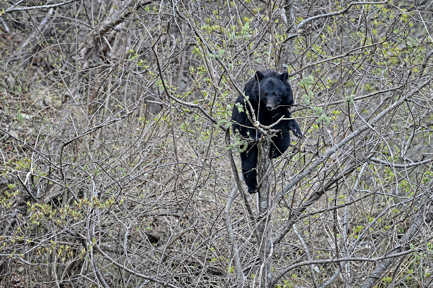 実際にツキノワグマが登っているところを目撃しました。柳の花や、新芽を食べていました。それにしても、細い枝にも器用に登ります。