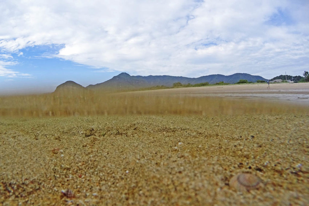 今回、画像で紹介している遠浅の海は、香川県観音寺市の有明浜。白砂の浜が2㎞続き、大潮の干潮時には幅約300mの砂の干潟が出現する。有明浜近くの琴弾公園には乗用車数十台分の無料駐車場あり。市営のキャンプ場(観音寺ファミリーキャンプ場)もある。