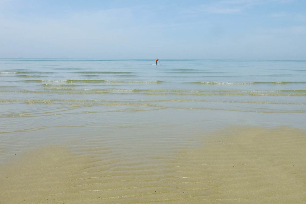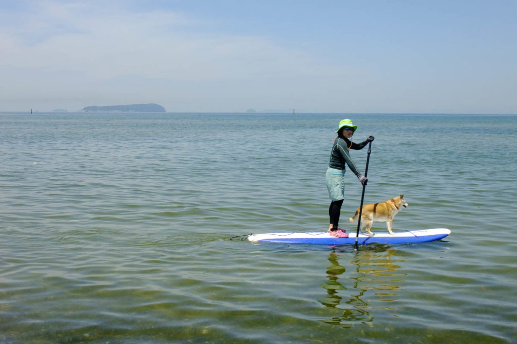 瀬戸内の遠浅の海はSUP初心者にやさしい。落ちても水深は膝だ。